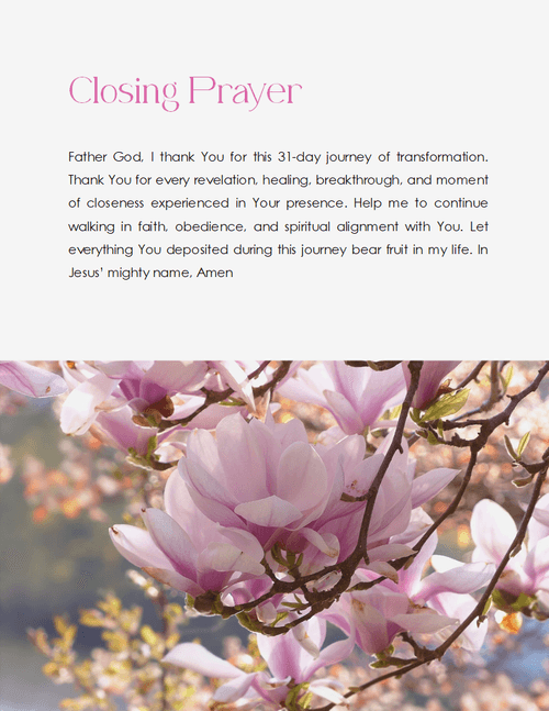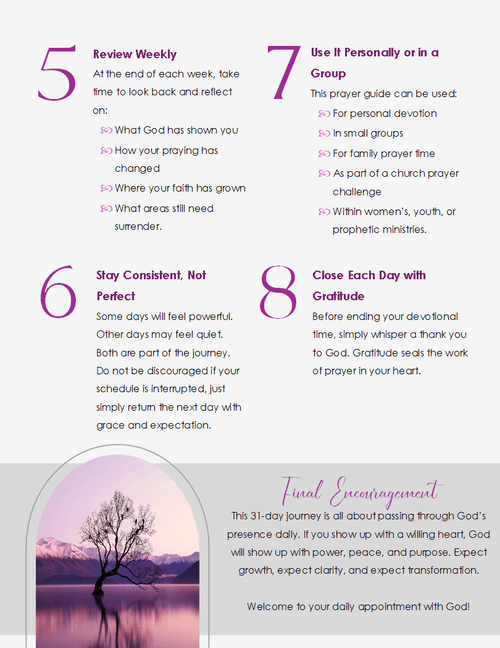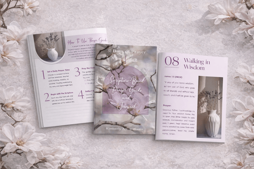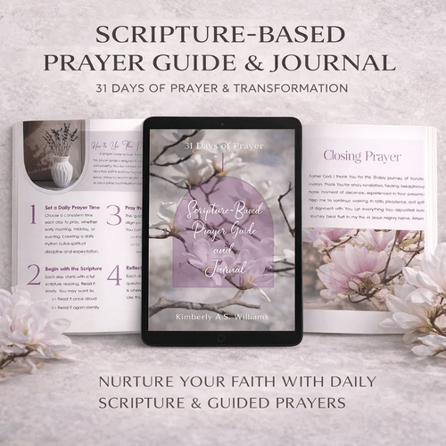 The 31-Day Scripture-Based Prayer Guide & Journal is a beautifully designed devotional resource created to help you deepen your relationship with God through daily Scripture, guided prayer, and reflective journaling.